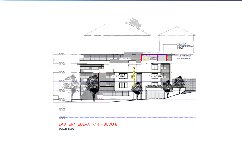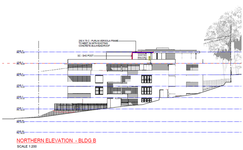 · On 8 April 2025 Council received a development application which seeks consent for a new vergola to the top floor unit B502 balcony and is accompanied by a Clause 4.6 variation request relating to the height of building development standard.