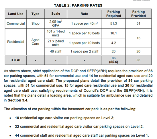 · That August 2020 traffic and parking impact assessment report considered the impact of a six-storey development that comprised a residential aged care facility containing 143 beds and a ground floor commercial premises of 2,051m2 (GFA) with on-site parking for 86 car parking spaces.